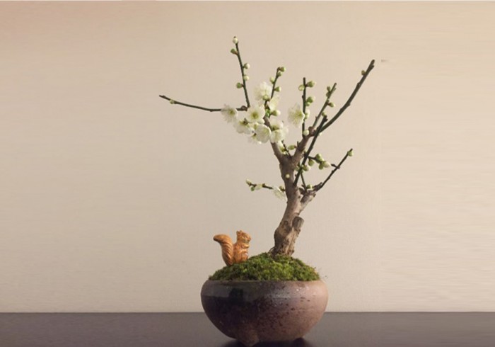 寒い冬につぼみを膨らませて、綺麗な花を咲かせ、縁起の良い花として昔から愛される梅の花の盆栽鉢を作成します。